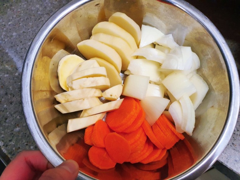 그래서 야채와 함께 넣어주면 고구마나 감자가 익을 때쯤 같이 익어집니다.