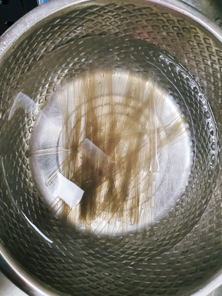 잡내 제거를 위해 우유에 닭을 재워둔 후, 30분 정도의 시간을 활용하기 위해 우선 당면사리는 물에 먼저 불려줍니다.