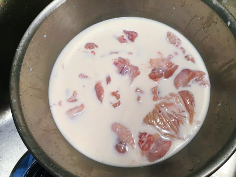깨끗한 물을 이용해 1차 불순물을 제거한 닭을 우유를 이용해 닭이 잠길 정도로 부어준 후, 30분 정도 재워둡니다.