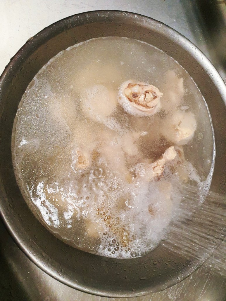 뼈나 닭에 붙어있는 잔여 지방과 내장을 깨끗하게 씻어주는 것이 잡내 제거의 중요한 포인트입니다.