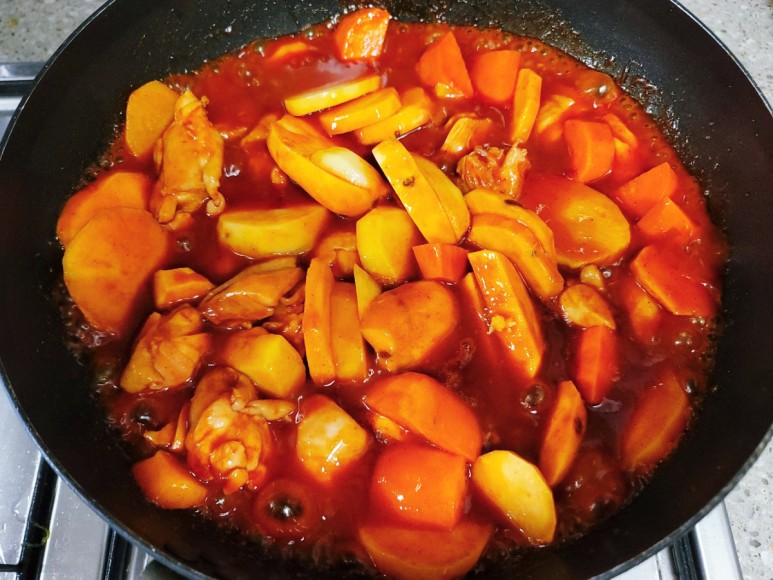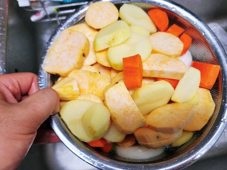 저는 익히는데 시간이 상대적으로 많이 소요되는 감자와 고구마 그리고 당근을 먼저 넣고 어느 정도 볶아주었습니다.