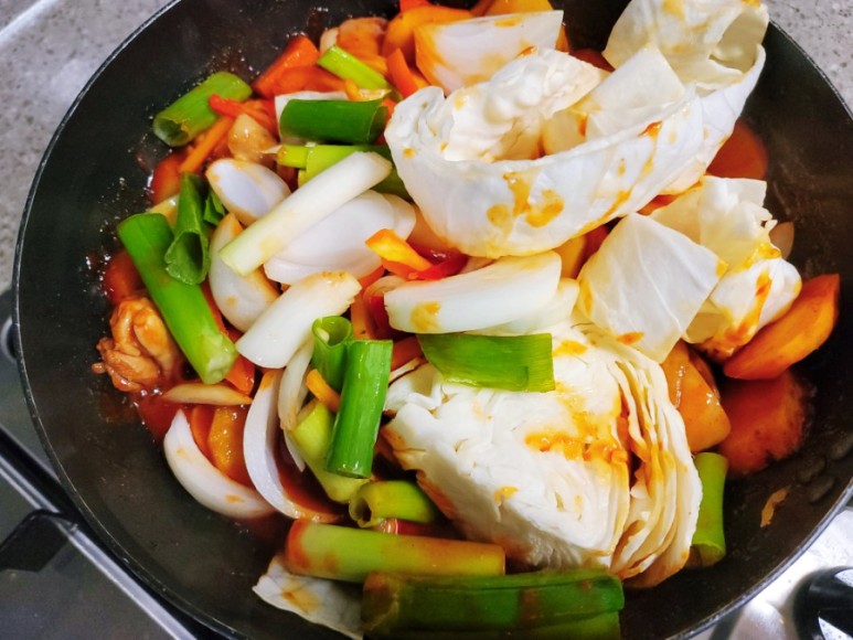 손질 채소를 포함해 더 넣어주고 싶은 손질된 채소들을 준비해 둔 후, 닭갈비가 어느 정도 익으면 채소를 넣고 약불에서 3~4분간 조리해 줍니다.