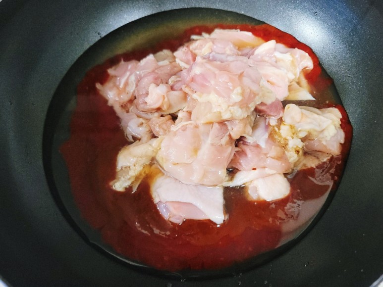 프라이팬에 닭고기와 하름 주물럭 소스와 함께 물 반 컵(100ml)을 넣고 중불에 약 8~10분간 볶아줍니다.