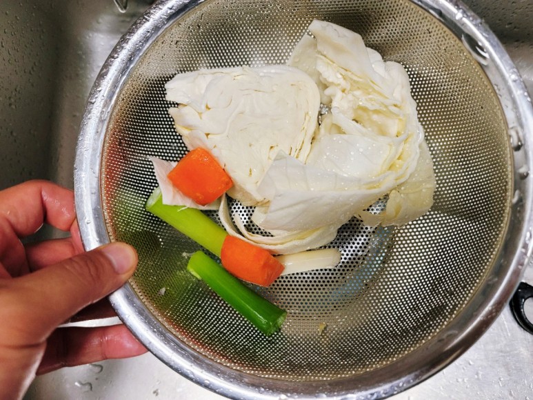 딱딱함이 가신 후에 기존에 밀키트에 포함되어 있던 손질 채소인 양배추와 대파 그리고 양파 등을 넣어주었습니다.