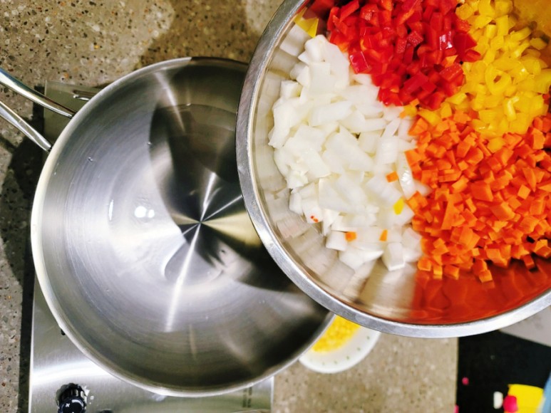 카레를 만들 수 있는 넉넉한 크기의 팬에 식용유를 두르고 난 후, 우선적으로 딱딱한 식감을 가진 채소들을 먼저 넣어서 볶아줍니다.