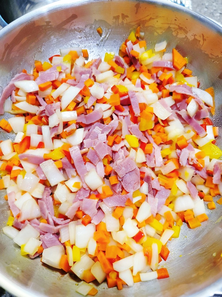 어느 정도 채소가 볶아지고 난 후, 아이들이 좋아하는 베이컨을 넣어준 후 추가적으로 5분가량 더 볶아 주었습니다.