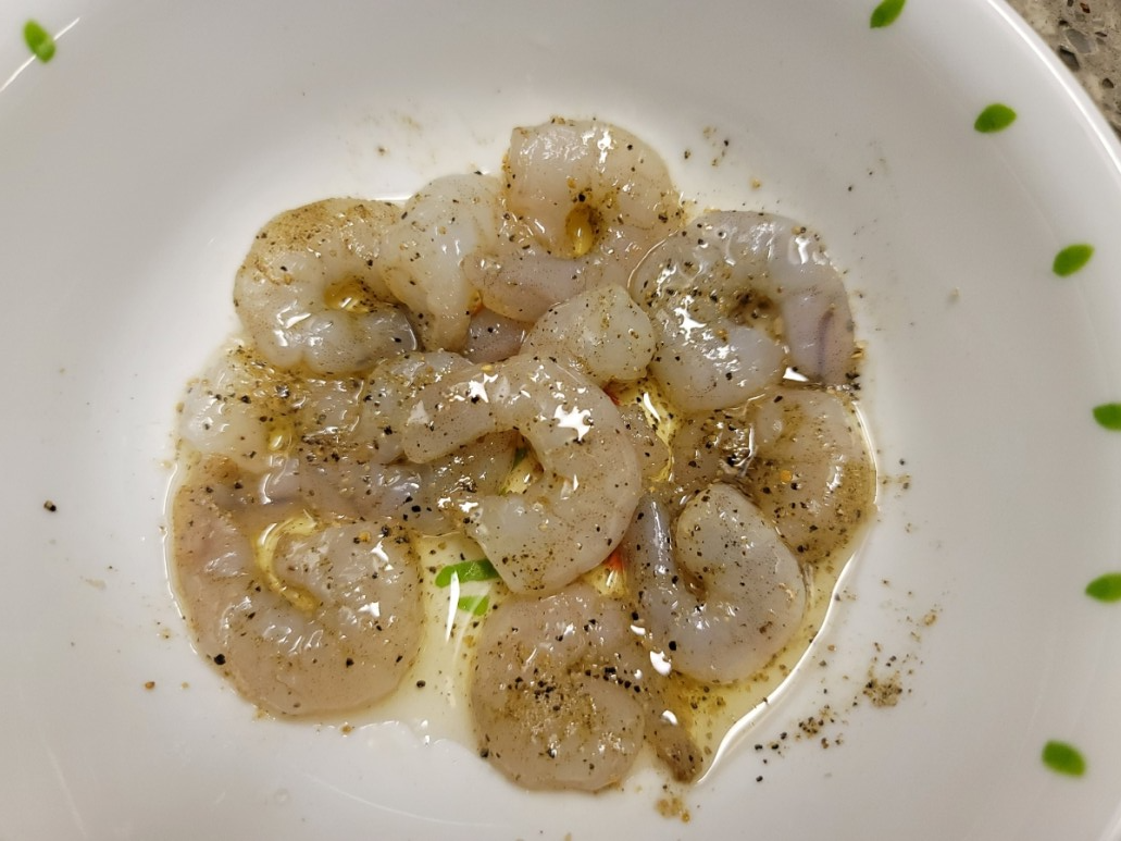 새우를 깨끗이 씻어 키친타월로 물기 제거한 뒤 허브맛솔트, 오일 1/2을 넣고 마리네이드를 해줍니다.