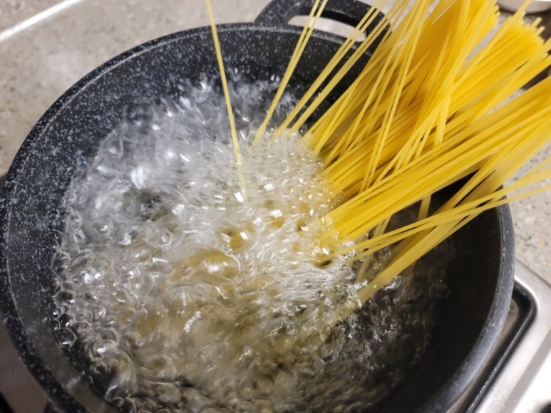 냄비에 물 1,400ml(종이컵 9컵 반)를 넣고 끓으면 파스타면을 넣고 7분간 삶아 파스타면을 체에 밭쳐 건져두기