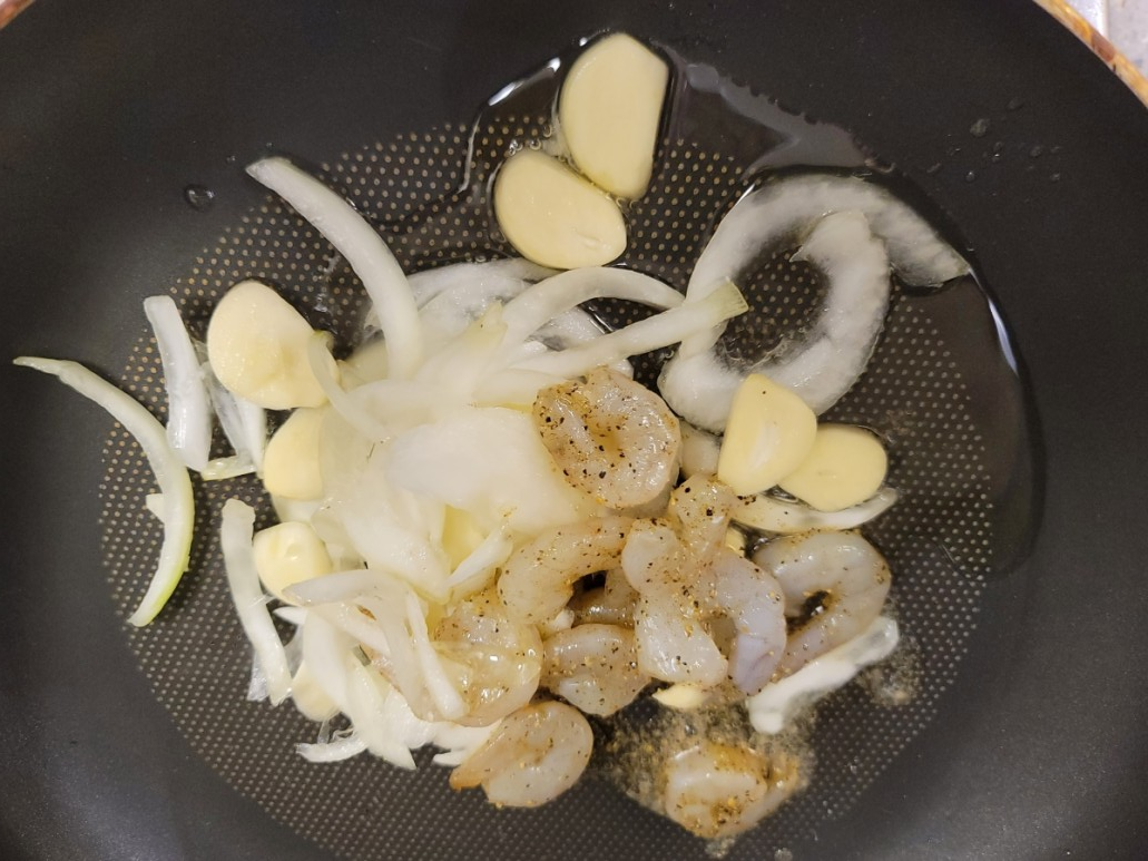팬을 강불로 1분간 예열한 뒤 남은 오일과 새우, 양파, 마늘을 넣고 중불로 1분간 볶아주면 됩니다.